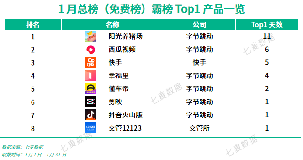 1 月总榜(免费)Top10 出现 >10 天的产品共计 11 款,其中,剪映、快手、阳光养猪场、快手极速版四款产品表现极为突出,当月累计在榜超 20 天。