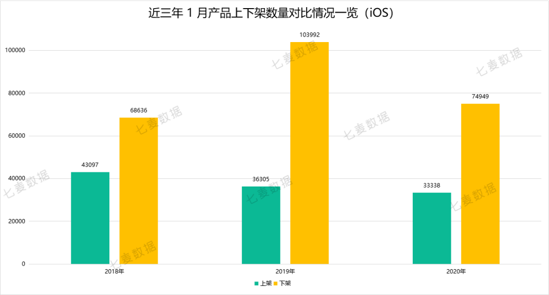 七麦数据此次针对最近三年 1 月的产品上下架情况进行分析,可以发现,新上架产品数量逐年走低,同时,对比去年 1 月超 10w 款产品被下架的情况来看,今年的情况也有所缓解。而根据比率计算发现,近三年 1 月上架与下架产品数量的比率分别为 62.79%、34.91%、44.48%,可以看出,苹果在审核上下架产品的数量上虽然有较大的变化,但整体波动情况已趋于稳定。