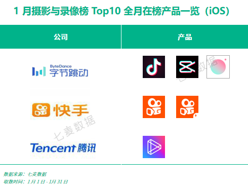 在以往被相机类产品占多数的摄影与录像榜中,在这个 1 月却被字节跳动、快手、腾讯三家的短视频产品占了多数。抖音与快手成为短视频领域的领头羊已有时日,在流量增长空间逐渐缩小之时,及时推出新产品,利用内部流量循环带动子产品增量,则显得尤为重要,抖音联动剪映与快手联动快手极速版也成功的印证了产品发力某一类垂直用户的重要性。
