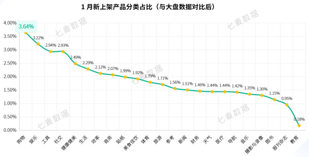七麦数据此次将 1 月的新上架产品与 App Store 目前的在架产品大盘数据进行对比后发现,购物、娱乐、工具类成为产品分类占比的 Top3,而在架产品的品类 Top3 依次为教育、商务、生活类,可见,由于教育、商务等类产品在 App Store 的产品数量基数较大,导致此类产品的上架数量往往也更多,但在产品分类占比中,则以购物、娱乐等类产品为多数。相关开发者可以根据苹果对于产品上下架的整体情况表现,做出针对自身产品的合理规划,及时关注产品所属领域变化趋势。