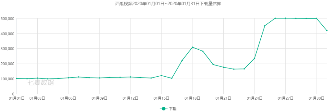 西瓜视频凭借抖音的集卡活动,加持后来《囧妈》的免费首映,使产品在 1 月得到了迅速增长,连续 5 天单日预估下载量破 50w。