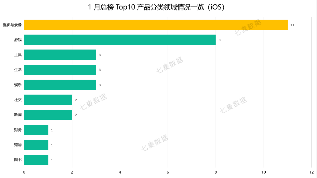 春节期间一向是老用户回流、新用户下载的高峰时期,选择在此期间推出相关活动获取流量也是众多产品竞相抢夺的行为之一。七麦数据此次选取 1 月总榜(免费)Top10 的产品趋势进行分析发现,摄影与录像类成为此次占榜数量最多的产品类别。