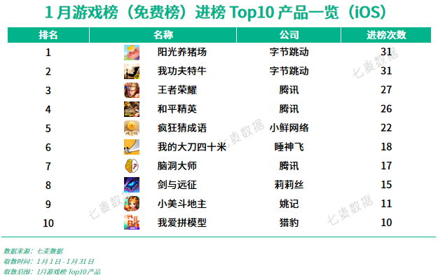 随着休闲游戏在市场份额中的占比逐渐增大,在 1 月游戏榜(免费)Top10 的产品中,也依然出现了休闲游戏占多数的情况。阳光养猪场凭借“养猪就能赚钱”的游戏玩法持续获量、我功夫特牛凭借抖音内部流量推广,两款产品均在 1 月累计进榜达 31 次,一度成为 App Store 游戏总榜(免费)的 Top1。王者荣耀、和平精英两款经典游戏在1月也有着不俗的表现,当月停留在游戏榜(免费)Top10 以内的时长均在 25 天+。
