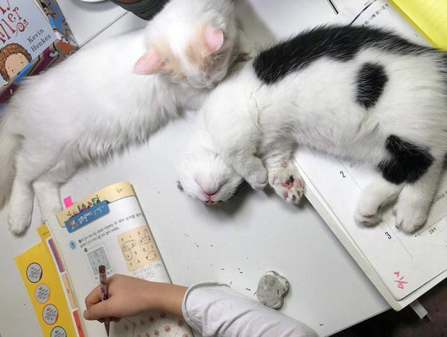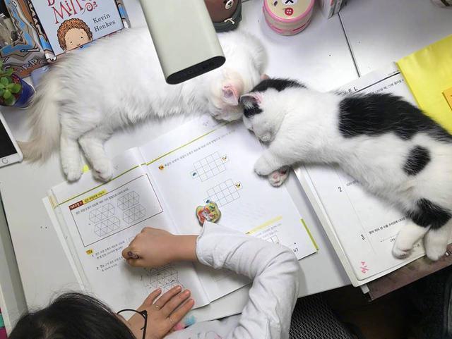 想想自己在旁边努力的写作业,旁边又有两只猫咪陪伴这是多么幸福的事。