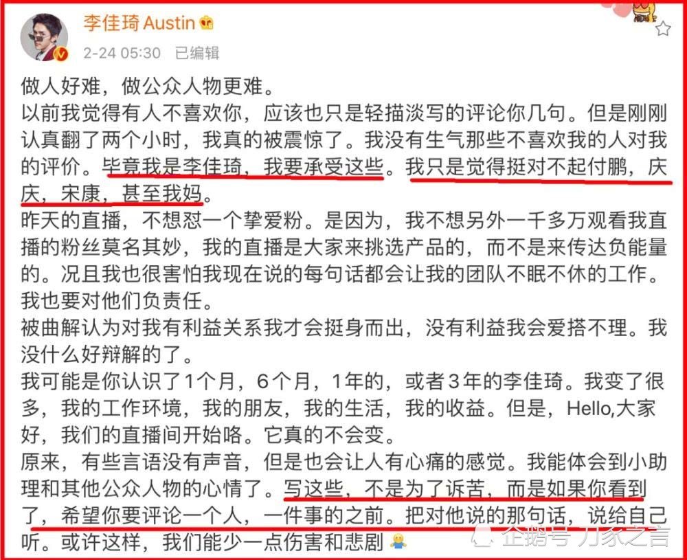 24日凌晨,李佳琦发长文并感慨:“做人好难,做公众人物更难。”
