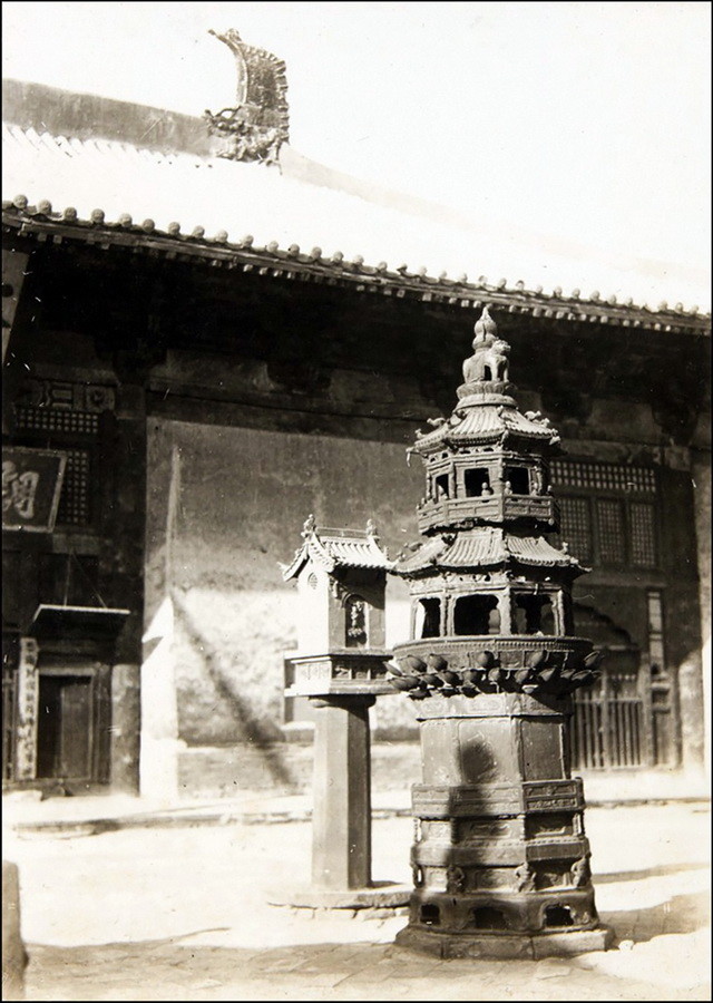 华严寺大雄宝殿内的经幢与铁炉,经幢在佛教中在石柱上刻有经文,片中后方的经幢建于辽道宗时代,前方的铁炉建于明万历年间。