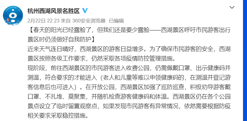2月22日,最早宣布恢复开放的杭州西湖,迎来景区封闭后的首个周末,当天下午4点,断桥游客量便已达到5100人次。随后,杭州多地发布紧急通告:疫情尚未解除,别忘佩戴口罩。