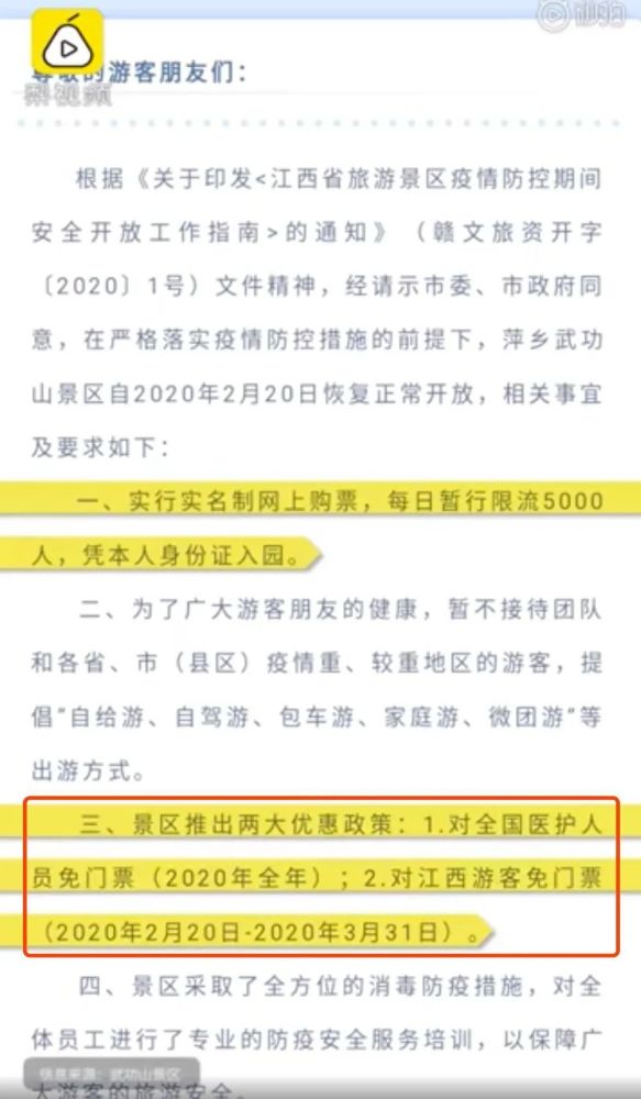 2月23日,江西武功山景区紧急发布通告:根据景区防疫防控要求,为确保游客的舒适度和健康安全,从即时起停售当日景区门票、索道票;2月24日起,景区限流人数从5000人下调至3000人,关闭线下售票窗口。