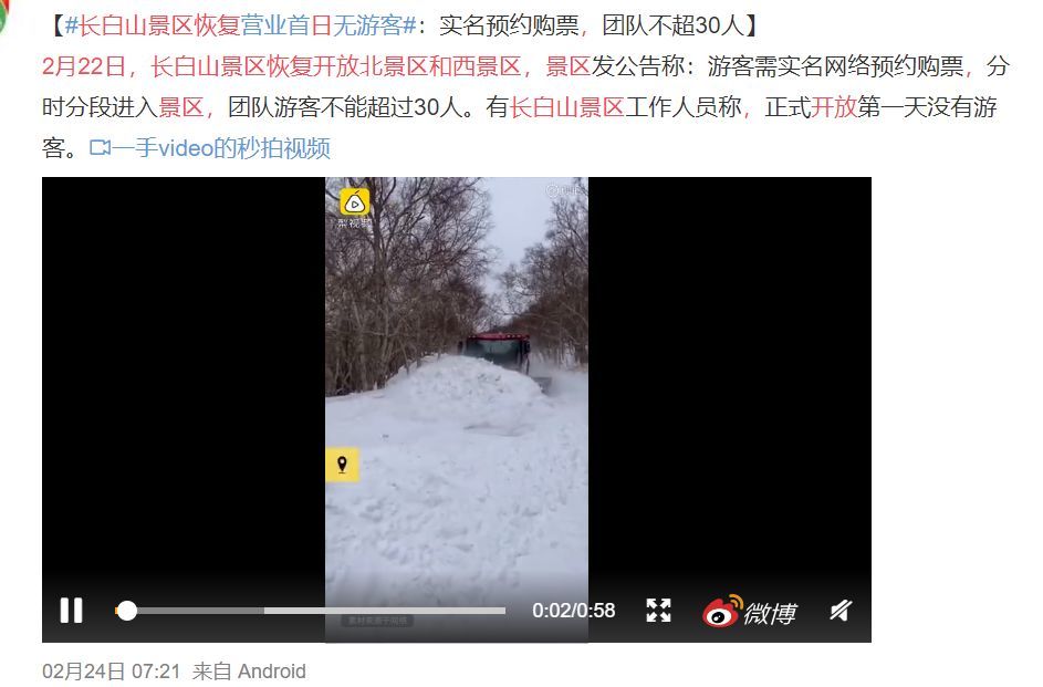 2月22日,长白山景区恢复开放北景区和西景区,正式开放第一天,甚至没有游客入园。