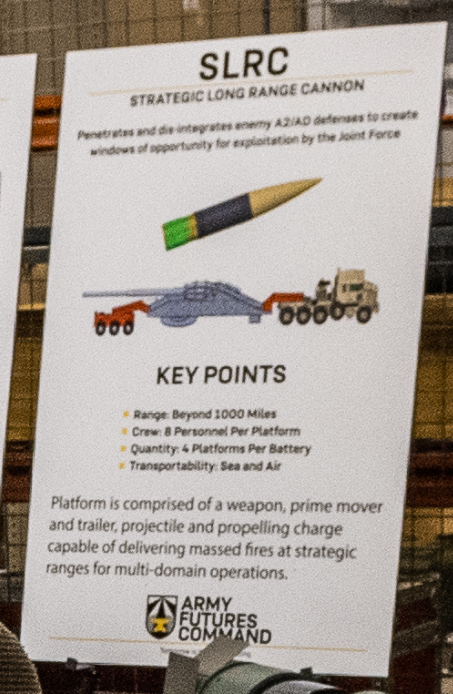 陆军研究实验室的账号说:“来自美国陆军未来司令部、美国陆军作战能力发展司令部,及其下属中心和实验室的军官们参观了演示,并汇报了实施互操作活动以降低风险的内容”。帖子中还给出了一张海报的照片,上面标明这种远程火炮的射程为1000海里,也就是1800多千米。
