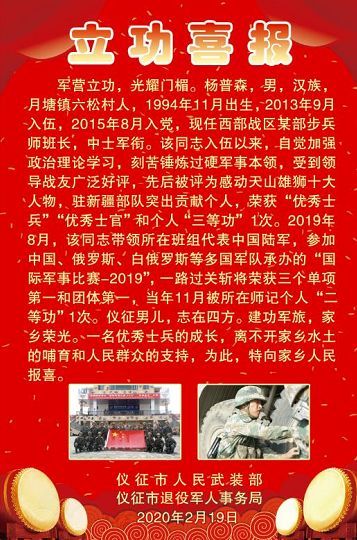 该团炮兵营仪征籍班长杨普森于2019年8月参加中国、俄罗斯、白俄罗斯等国承办的“国际军事比武竞赛-2019”夺得3个单项第一和1个综合第一,去年底被所在师记个人二等功1次。