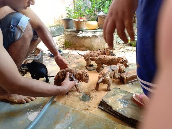 他往井里看,发现下面有5个泥巴球,在井底不停扭动,不知道在下面困了多久!还好这口井不是很深,他立刻跳到井下面,用一个簸箕帮忙把5个泥巴球给捞上来。捞上来后才发现,原来是5只小狗!每只小狗身上都占满泥巴,连眼睛都快看不见。他立刻用水把它们身上的泥巴冲洗干净。狗狗看起来没有大碍,在洗澡的时候还玩得特别开心。