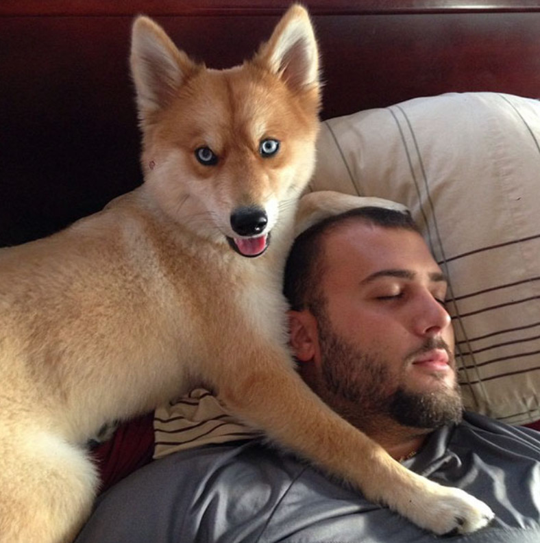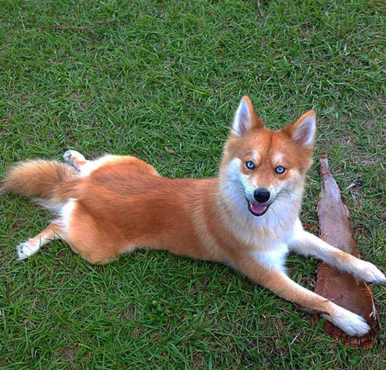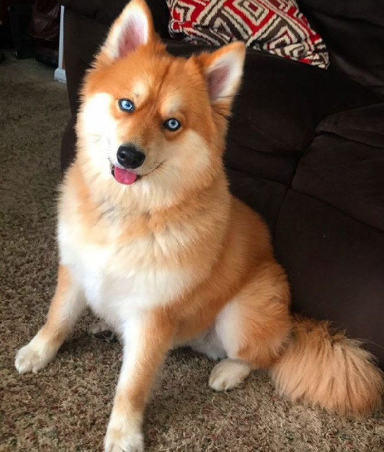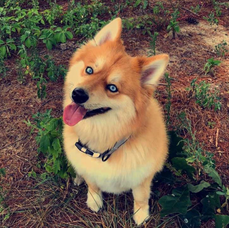 这样一来就比较清晰了,狗狗蓝色的眼睛很明显是遗传了哈士奇的基因,至于脸型,它应该是综合了哈士奇和博美的脸型吧。