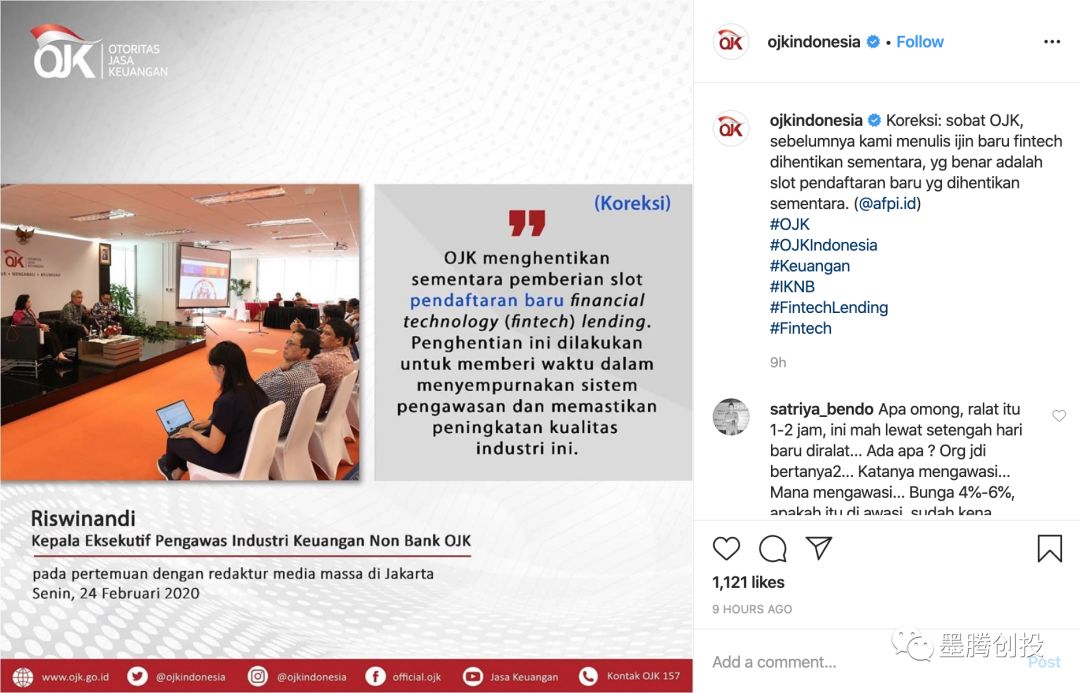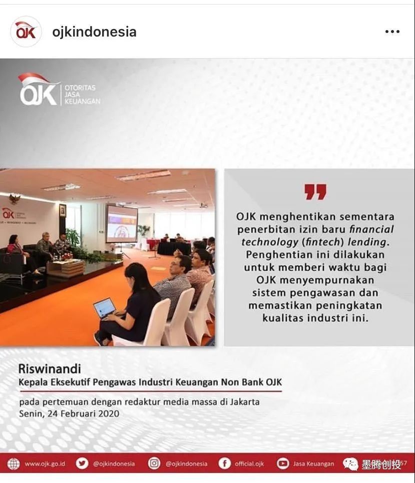 周一,众多在等待P2P牌照申请的印尼金融科技公司突然愣住了。因为印尼金融管理局OJK的官方Instagram上出现了这样一条信息: