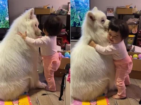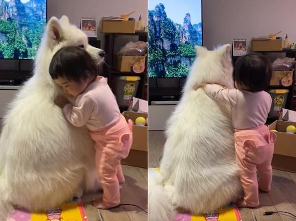 一主人家里养了一只萨摩耶奶茶,奶茶和小主人的感情非常好。这天妹妹看到狗狗独自坐在客厅发呆,就慢慢走过去给了一个大大的拥抱。妹妹站在旁边,还没有狗狗坐着那么高,和狗狗的体型一对比超萌。这么大的“毛绒公仔”,抱起来肯定很舒服。