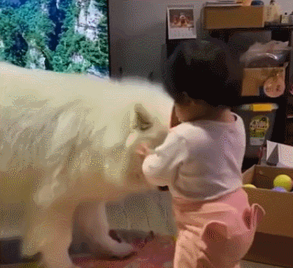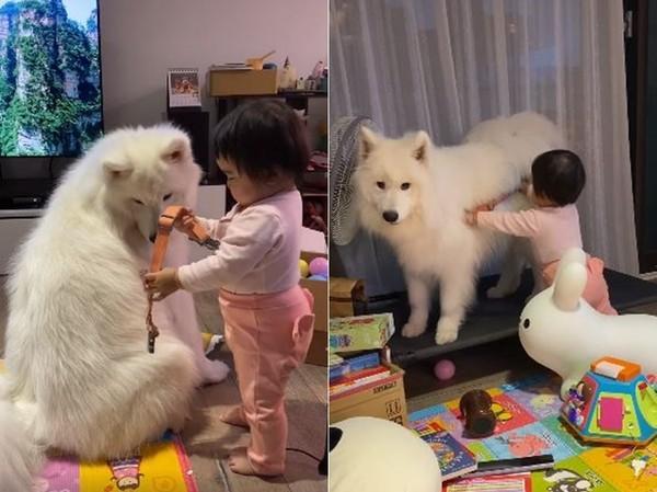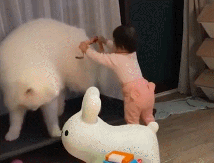 狗狗和妹妹之间的互动,连主人都直呼“太可爱了”!就像姐姐被妹妹缠着要玩游戏,不想跟她玩儿只能一直跑了。不得不感叹,这只萨摩耶的脾气真的很好,被小孩子追着也只会多。