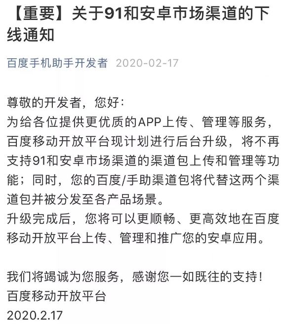 这个月底,豌豆荚的 PC 版将在本月月底正式停止服务;另一家手机助手应用 PP 手机助手也表示 iOS 客户端和 PC 客户端都将下线;而在这个月早些时候,91 手机助手的母公司百度手机助手也发出通知表示「不再支持 91 和安卓市场渠道的渠道包上传和管理功能」。