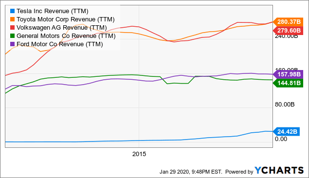特别是对于那些相信世界汽车年销售量已经达到「峰值」的人而言,他们不得不期望特斯拉未来的收入增长中的很大一部分是「抢夺」主要竞争对手的其它车企的市场份额。其中包括日本的丰田、德国的大众、以及美国的通用和福特。目前这四家公司合计的年收入超过 8000 亿美元,而特斯拉的 2020 年收入估计约为 300 亿美元。