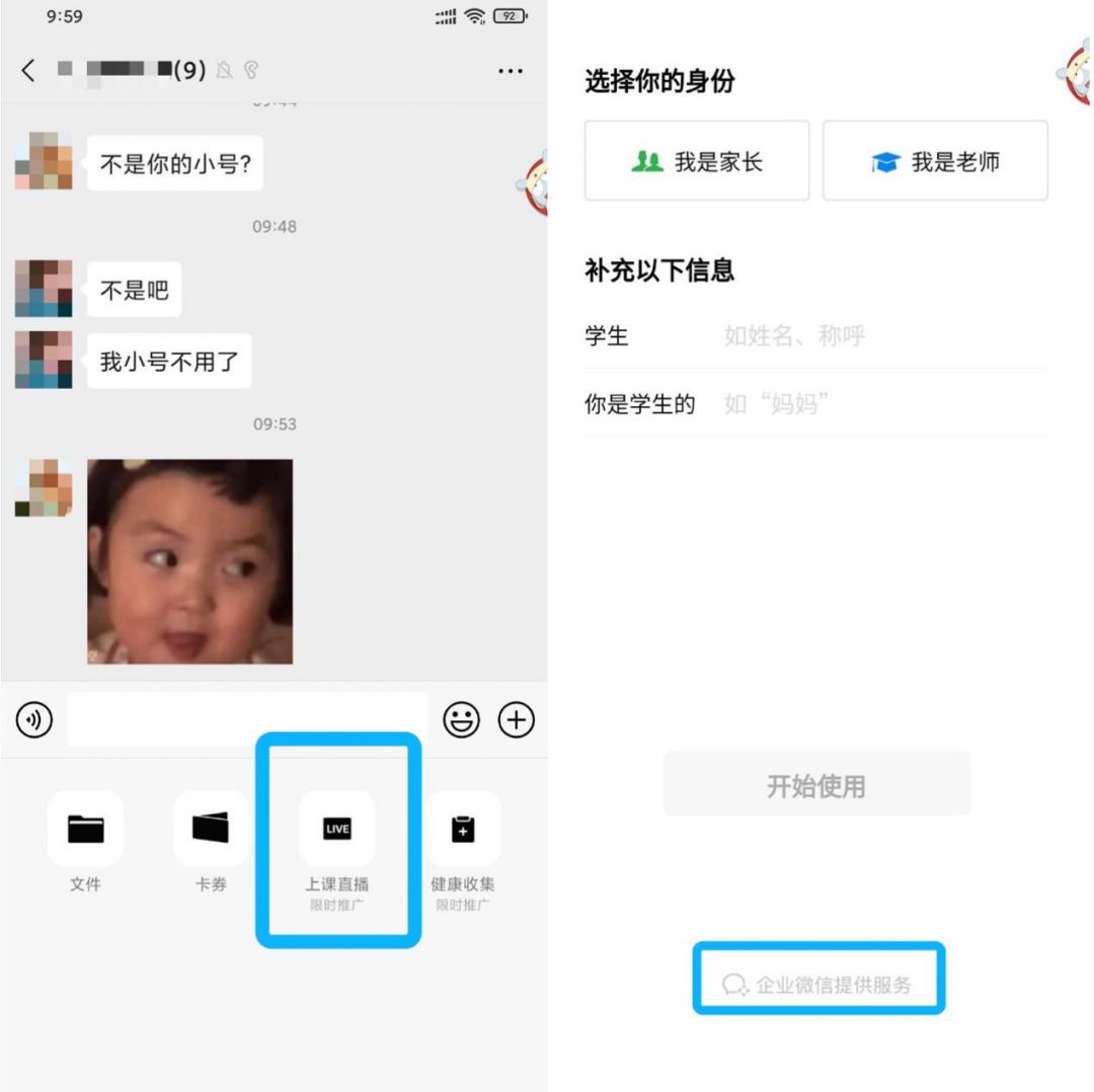 如图所示,一些微信群在「+」按钮功能内,出现了「上课直播」按钮,用户点击后,便会跳到身份验证页面,进行家长还是老师的验证,值得注意的是,身份验证服务是由企业微信提供的。