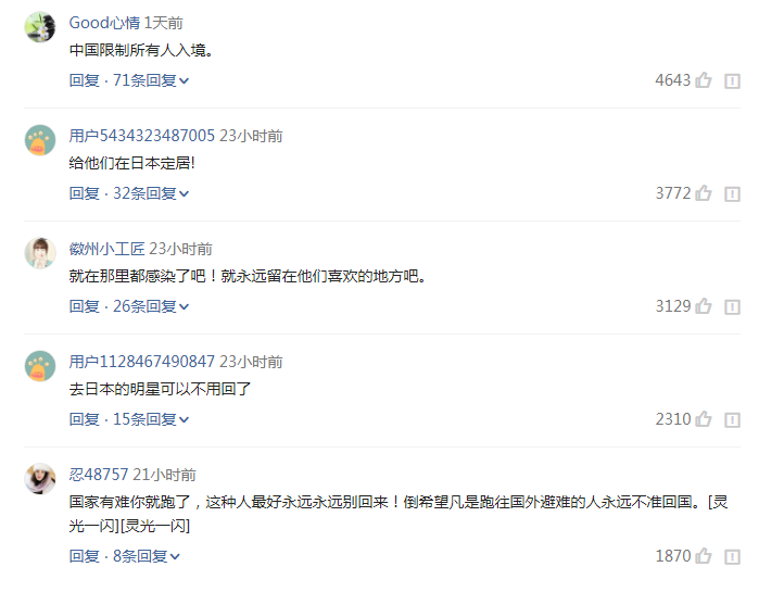 看到这样的消息,网上有不少网友都吐槽这些明星的行为,当国家有难的时候,他们选择了在第一时间离开,可是现在日本面临着这种情况,或许会直接封城,不知道他们能不能顺利回国。有些网友甚至发表了更难听的言论。可是实话实说,虽然之前的做法让很多人觉得有些生气,但毕竟是中国同胞,如果国内安全的话,肯定还是会欢迎他们回来。