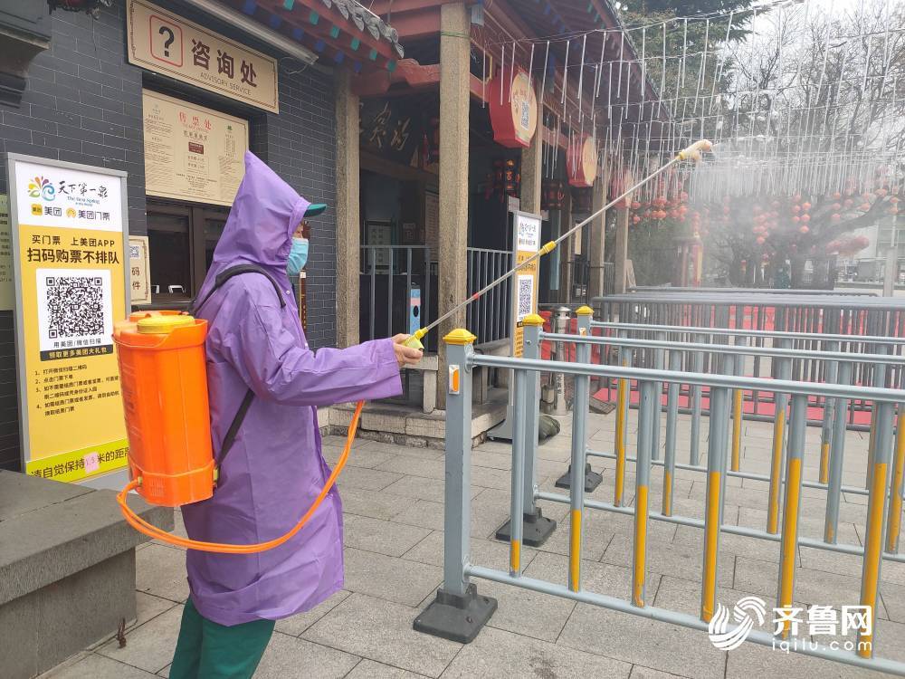 趵突泉公园入口处显眼位置,设置了购票二维码,并提示保持1.5米的间隔距离,也有工作人员不时进行消毒。