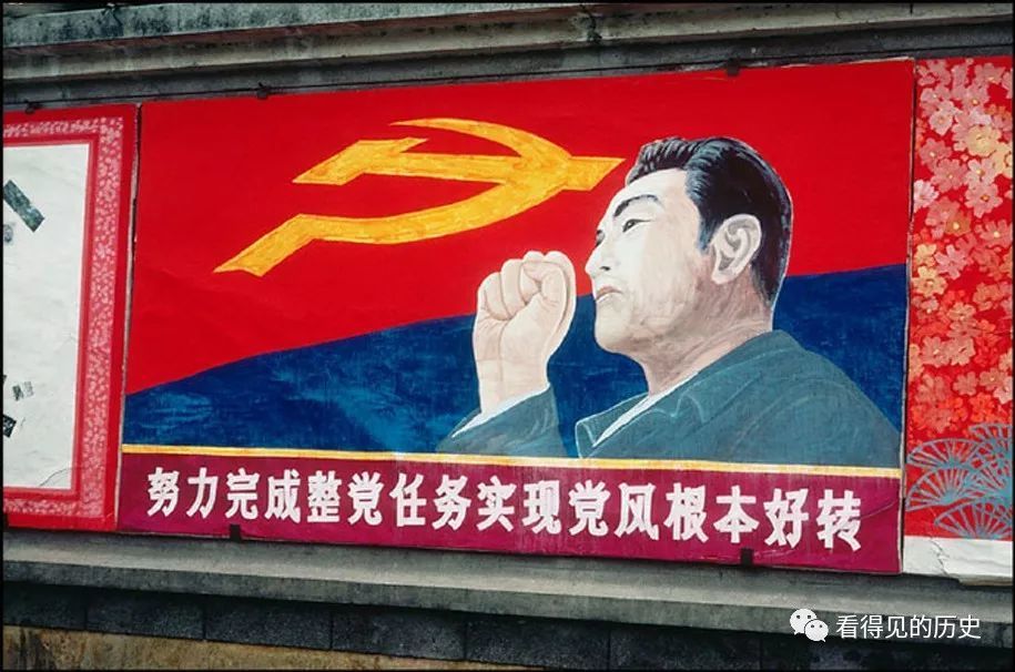 街头的手绘宣传画,上面写着“努力完成整党任务 实现党风根本好转”。