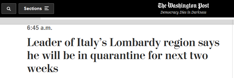【环球网报道 记者 王博雅琪】据《华盛顿邮报》报道,当地时间26日稍晚时候,意大利伦巴第大区主席丰塔纳(Attilio Fontana)透露在接下来的两周里将进行自我隔离。报道称,得知一位“亲密合作伙伴”感染新冠肺炎后,丰塔纳接受了病毒检测——尽管结果呈阴性,但他仍表示,自己将遵守意大利卫生官员对其他民众提出的隔离要求。