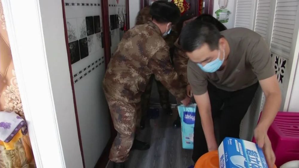 在吉林通化,通化军分区官兵每天都会到民兵装备仓库保管员王丹家里,送上新鲜蔬菜、婴儿奶粉、消毒液等生活用品。