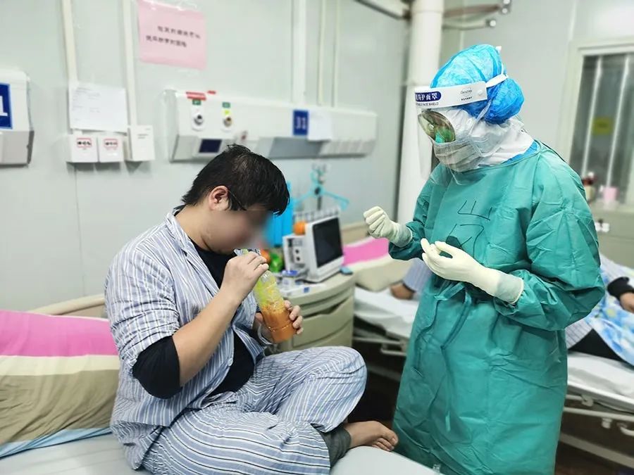 “鼻孔吸气、屏气、嘴向吸管吹气。”在呼吸治疗师指导下,一线医务人员结合临床经验发现:患者每天分次练习300次左右的深呼吸,伴随着水瓶内“呼噜噜”的声音,能够改善患者的肺功能。感染四科一病区医生刘正钊告诉记者:“患者陈先生每天坚持吹水瓶练习,目前呼吸功能有改善比较明显,再经过几天科学治疗,就可以康复出院。”