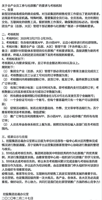 昨天开始,有苏宁员工在网上爆料,苏宁逼迫全产业员工参与社群推广和销售。根据苏宁发布的公告,此次考核涉及苏宁集团全产业(总部、大区)管理干部(不含终端人员),但据苏宁内部员工爆料,考核对象实则包括非业务岗和销售岗的所有员工;考核时间为2020年2月27-29日;考核标准为人均保底2单,且订单总金额达到1000元以上。