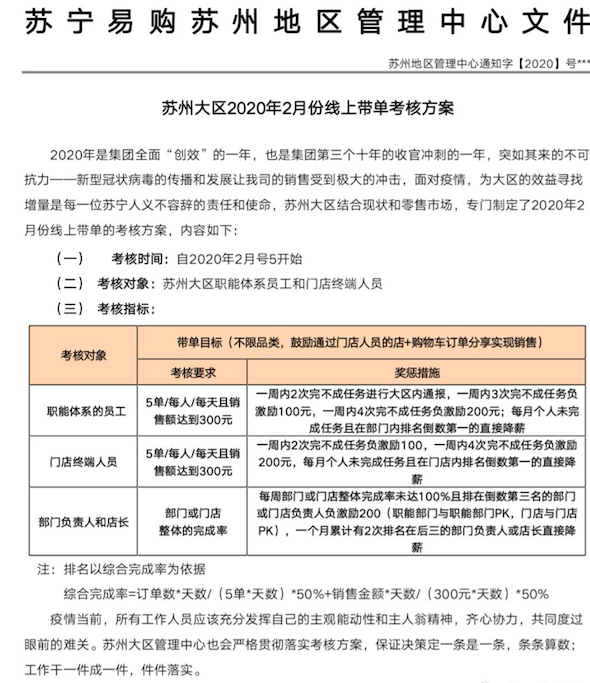 这次考核方案与昨天苏宁发布的全员公告略有不同,“要求参与考核的员工每人每天销售5单产品,且销售额达到300元”,并配备相应的惩罚措施。