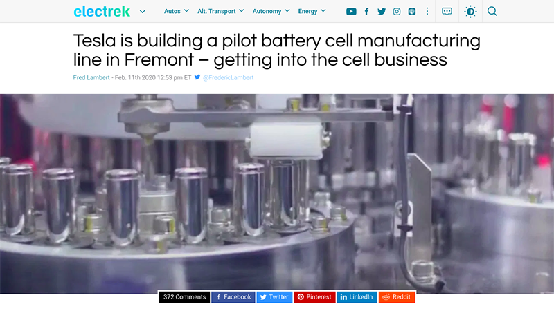 2020年2月12日,外媒electrek曝料称,特斯拉正在美国弗里蒙特工厂搭建一条动力电池生产线。一时间,特斯拉自产动力电池的消息公之于众,引发了业界震动。
