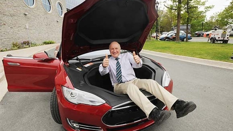达成合作协议之后,杰夫·戴恩老爷子一屁股坐进了特斯拉的前备箱,比出两个大拇指,兴奋之情溢于言表。