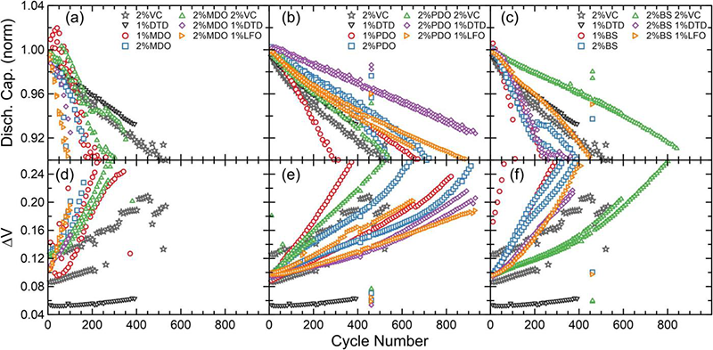 其中,添加了三种电解质添加剂组合的电池普遍在3000次充放电循环之后,还能保持85%以上的电池容量,有一组甚至在经历了5000次充放电循环之后,仍然保持了90%以上的电池容量。