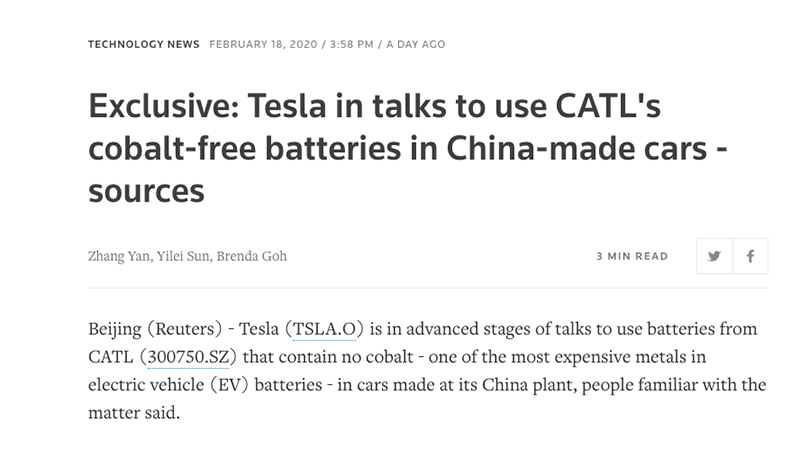 此外,路透社还报道,特斯拉正在与宁德时代就“无钴”电池进行进一步商谈,特斯拉未来很可能会使用宁德时代生产的“无钴”电池。