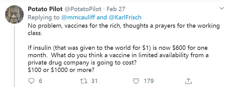 在他这条推文下,一名网友愤怒地写道:“好啊,有钱人用疫苗,我们工薪阶层就靠祈祷”,网友还称,疫苗价格会被私营药企炒高。