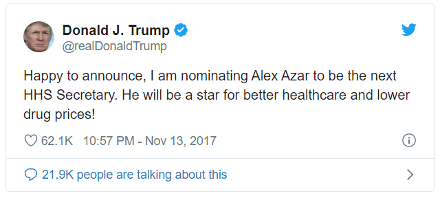 讽刺的是,在2017年11月,特朗普还在阿扎尔上任时立了“flag”,称阿扎尔是“带来更好医疗服务、控制药价的明日之星”。