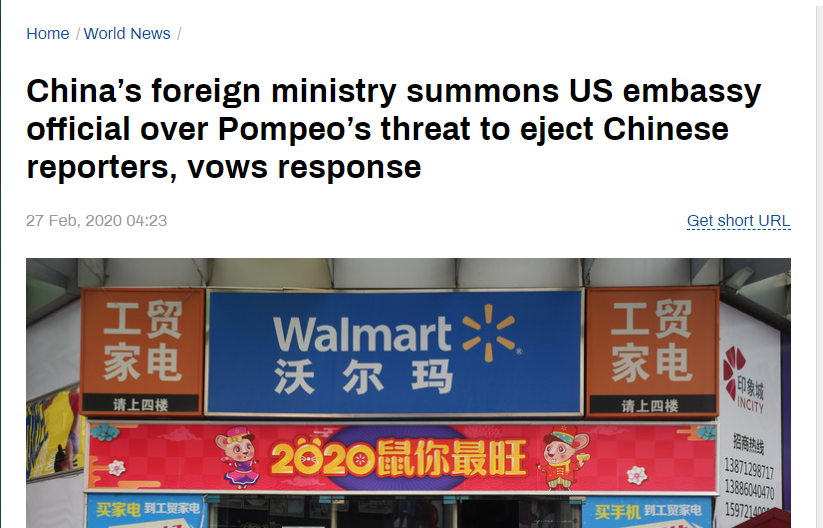 据俄罗斯RT新闻和路透社报道,中国外交部周三召集了美国驻华大使馆外交官,就美国国务卿迈克·蓬佩奥(Mike Pompeo)谴责中国政府上周驱逐三名《华尔街日报》记者并暗示美方将采取更严厉行为的错误言论发表严厉声明。