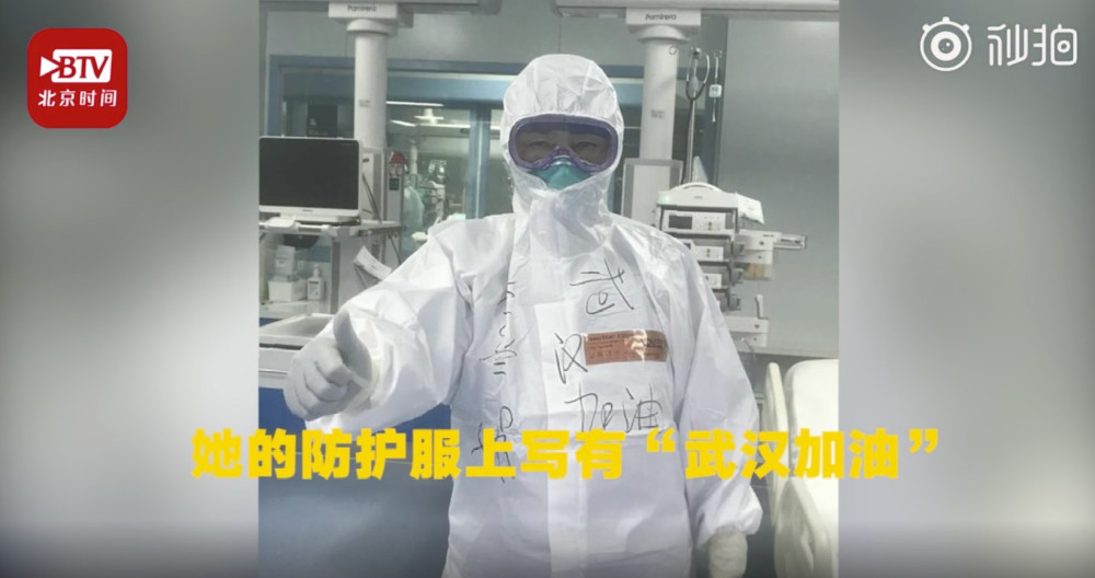 别人的防护服写名字,她的防护服还多写了四个大字:“武汉加油”。