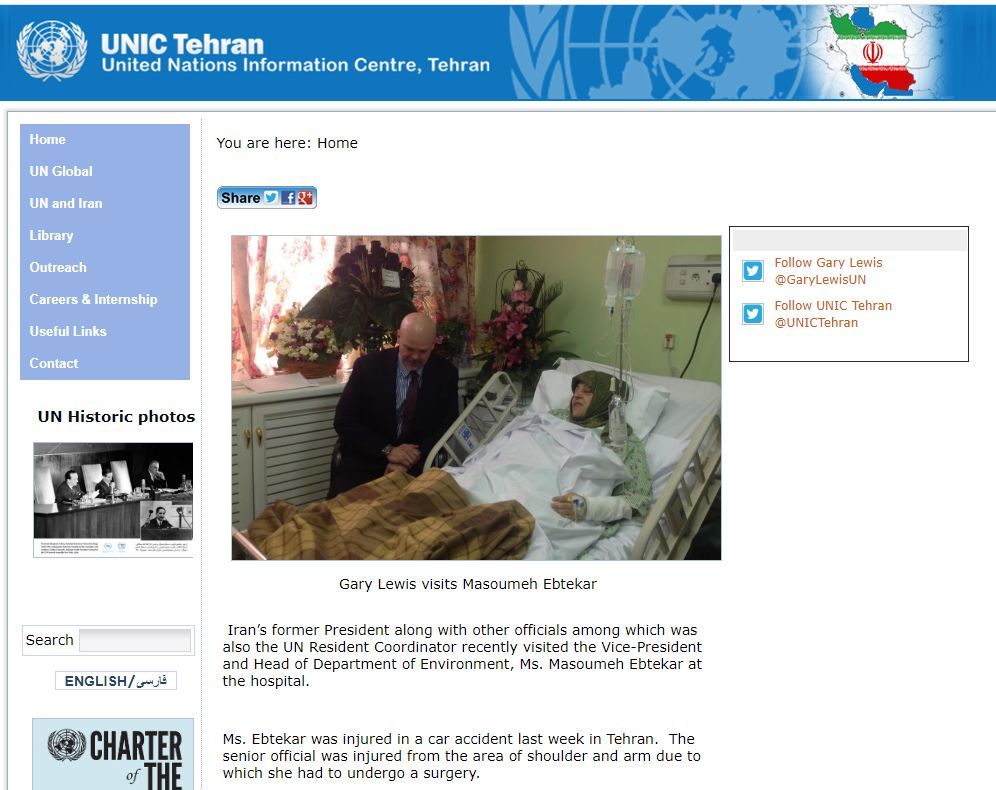 于是,我们用伊朗这位副总统的名字Masoumeh Ebtekar和hospital(医院)这两个关键词在境外的社交平台推特上进行了一番搜索后,发现了一位认证为联合国环境规划署官员的男子,曾经在2014年发布过一则帖子,说他在医院里看望了当时因车祸住院的这位副总统。