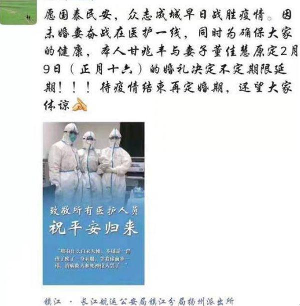 就这样,为了支援疫情工作,两个年轻人放下了已经准备好的婚服,穿上了护士服和警服,共同坚守在此次的岗位上。