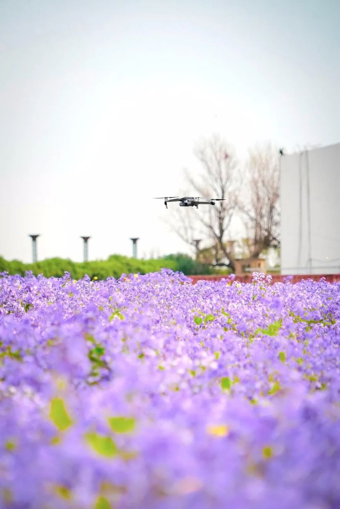 原本尘土飞扬的厂区荒地,就像变魔术一样,如今已被庞大密集的的紫色二月兰花海厚厚覆盖。