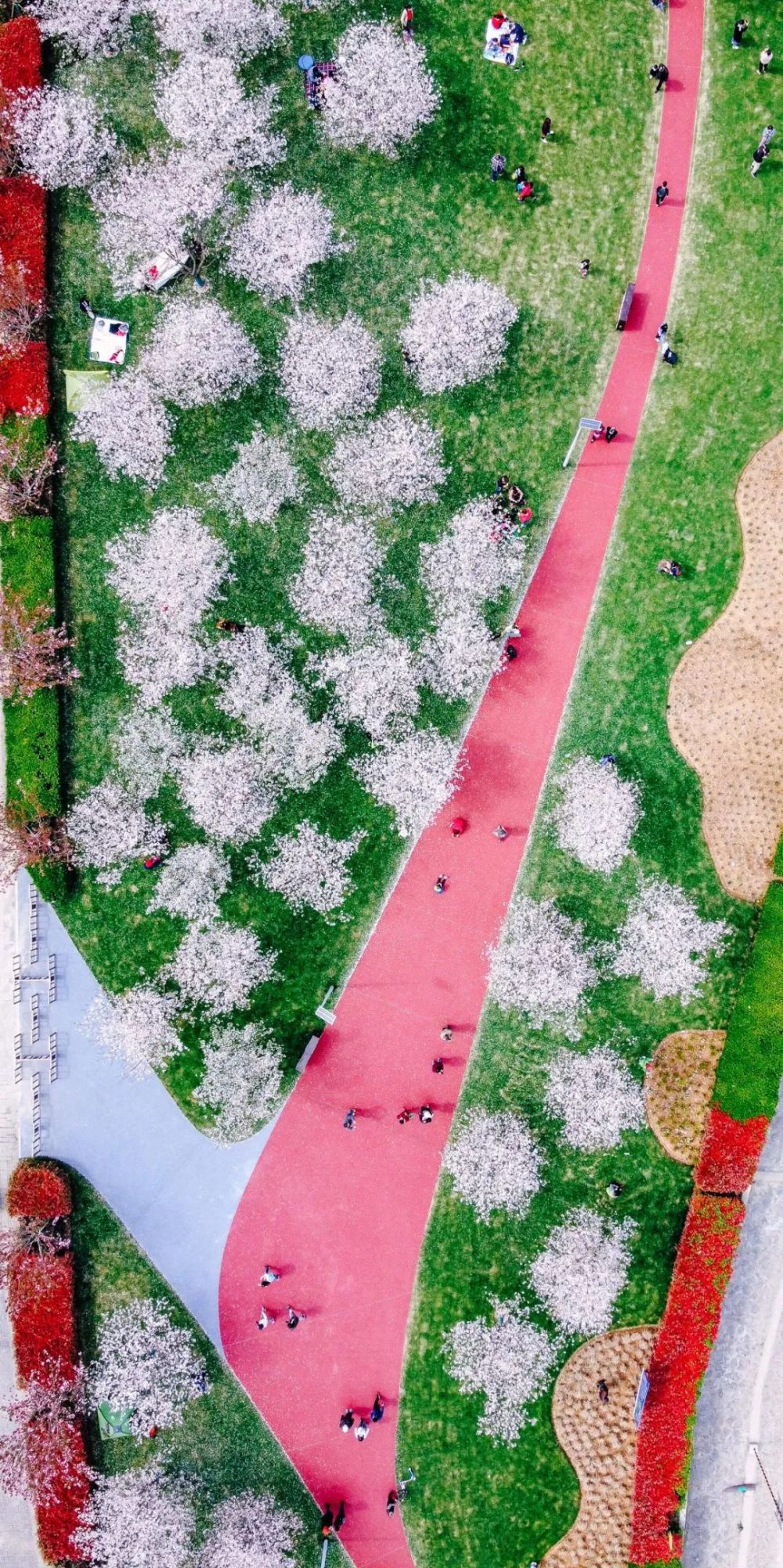 无人机捕获到的上帝视角里,一团团樱花树像炸裂的粉白色蘑菇云,十分震撼!