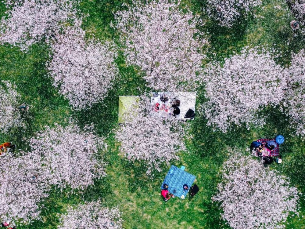 找片无人的草地,铺开餐垫,暂时摘下口罩。江边风大,随时都能邂逅一场绝美樱花雨。