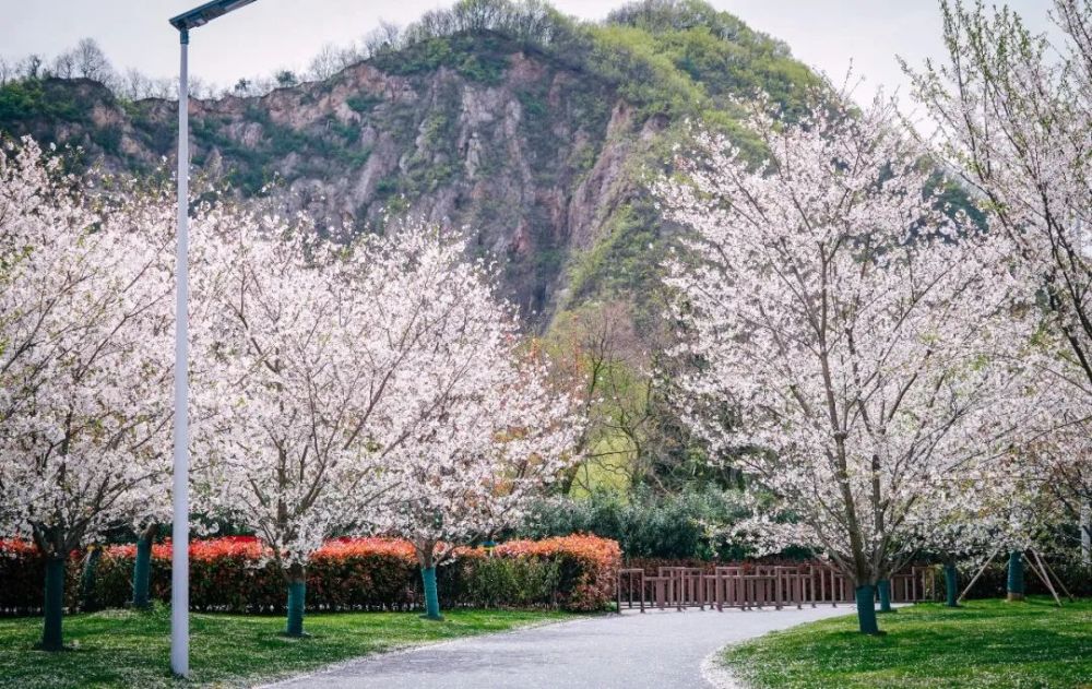 亲测,这里樱花已经进入盛放期,5000多株樱花密集排列在山脚、草地、江畔。