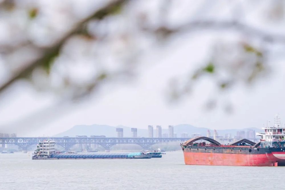 而左手边江水渺茫,货船呜咽。一曲“浪奔、浪流”的bgm涌动在心头,猝不及防,解锁了用樱花作前景的大桥视角!