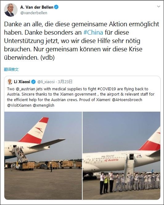 当地时间23日,奥地利总统范德贝伦在其个人推特上转发了中国驻奥地利大使李晓驷有关抗疫物资抵达的推特,并表达了感谢之情。