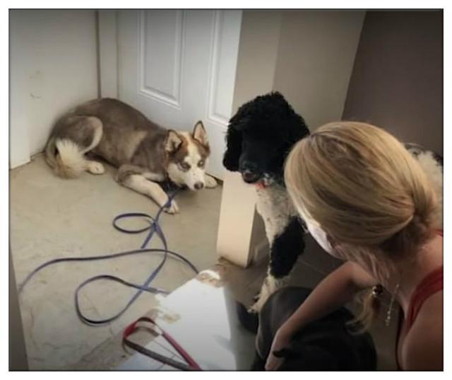 画面中的这只哈士奇是几位宠物救助人员救下来的,狗狗不知道这些救助人员要对它做什么,但狗狗曾经的经历让它下意识地认为救助人员要伤害它,惊恐地往墙角钻着,恨不得从墙角消失。