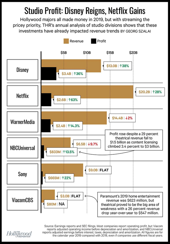 好莱坞另外几家传统片商的日子更难过。华纳兄弟去年票房收入为 44.23 亿美元,环球影业为 36.71 亿美元,索尼影业为 33.51 亿美元。再算上影片高昂的制作和宣发成本,除了迪士尼外,没有任何一家的利润可以超过 Netflix。