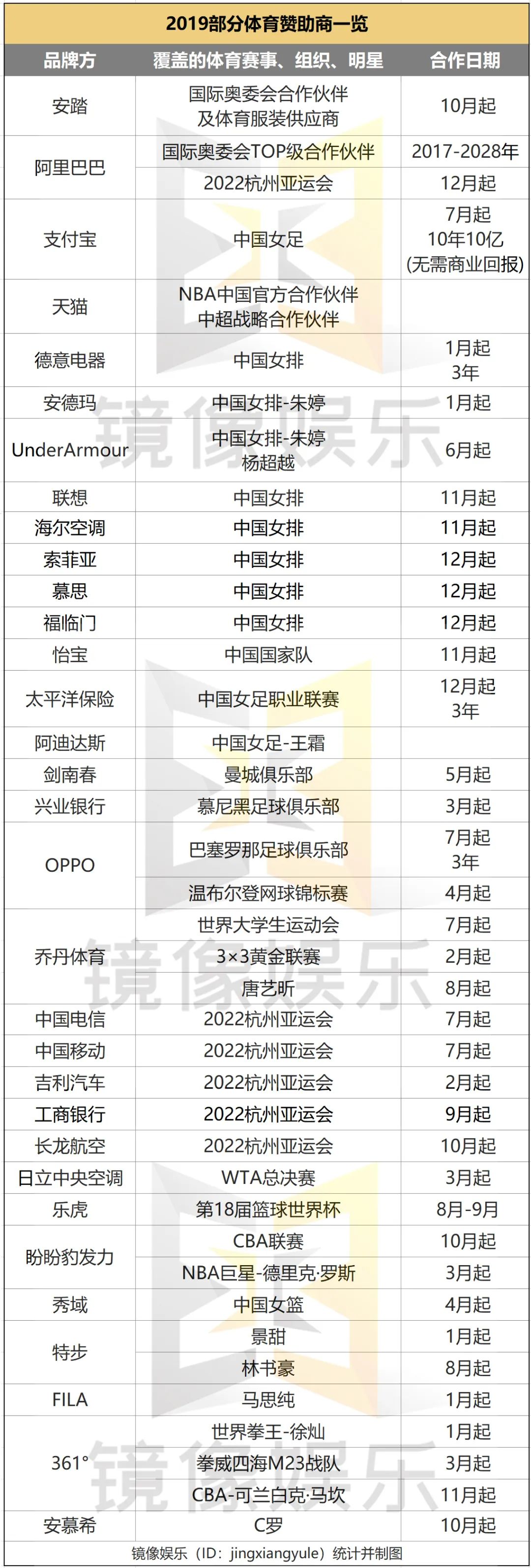 据镜像娱乐不完全统计,仅在2019年,与体育赛事、相关组织、体育运动员/明星达成赞助或代言合作的品牌方至少在30家以上。其中,在中国女排拿到东京奥运会入场券之后,联想、海尔空调、索菲亚、慕思、福临门等品牌方都与其达成合作。